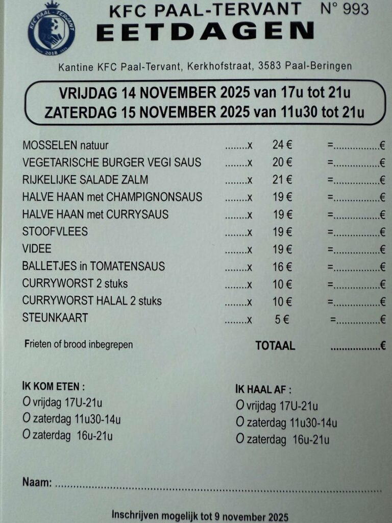 Op vrijdag 14 november (17u – 21u) en zaterdag 15 november (11u30 – 21u) organiseert KFC Paal-Tervant opnieuw zijn jaarlijkse eetdagen in de kantine (Kerkhofstraat, Paal-Beringen).